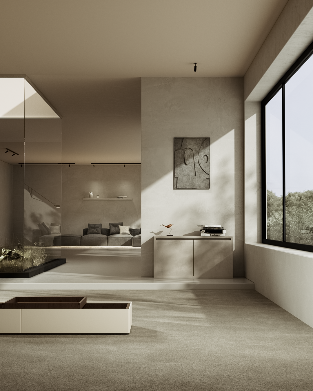 Interior still images with a contemporary and calm aesthetic, using neutral tones.